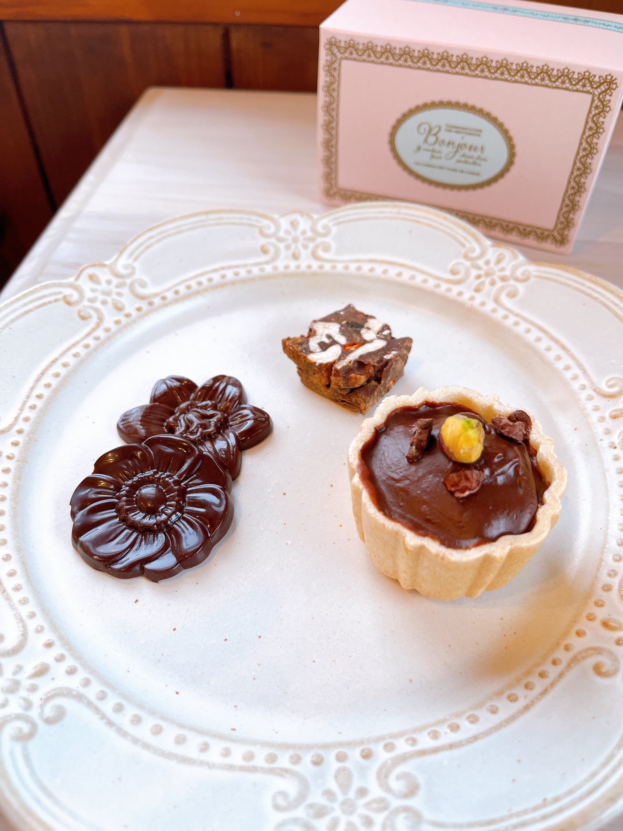 ポルトボヌールの人気ローチョコサラミ、もなかタルト、シンプルなローチョコレートを少しづつセット致しました(^▽^)/
