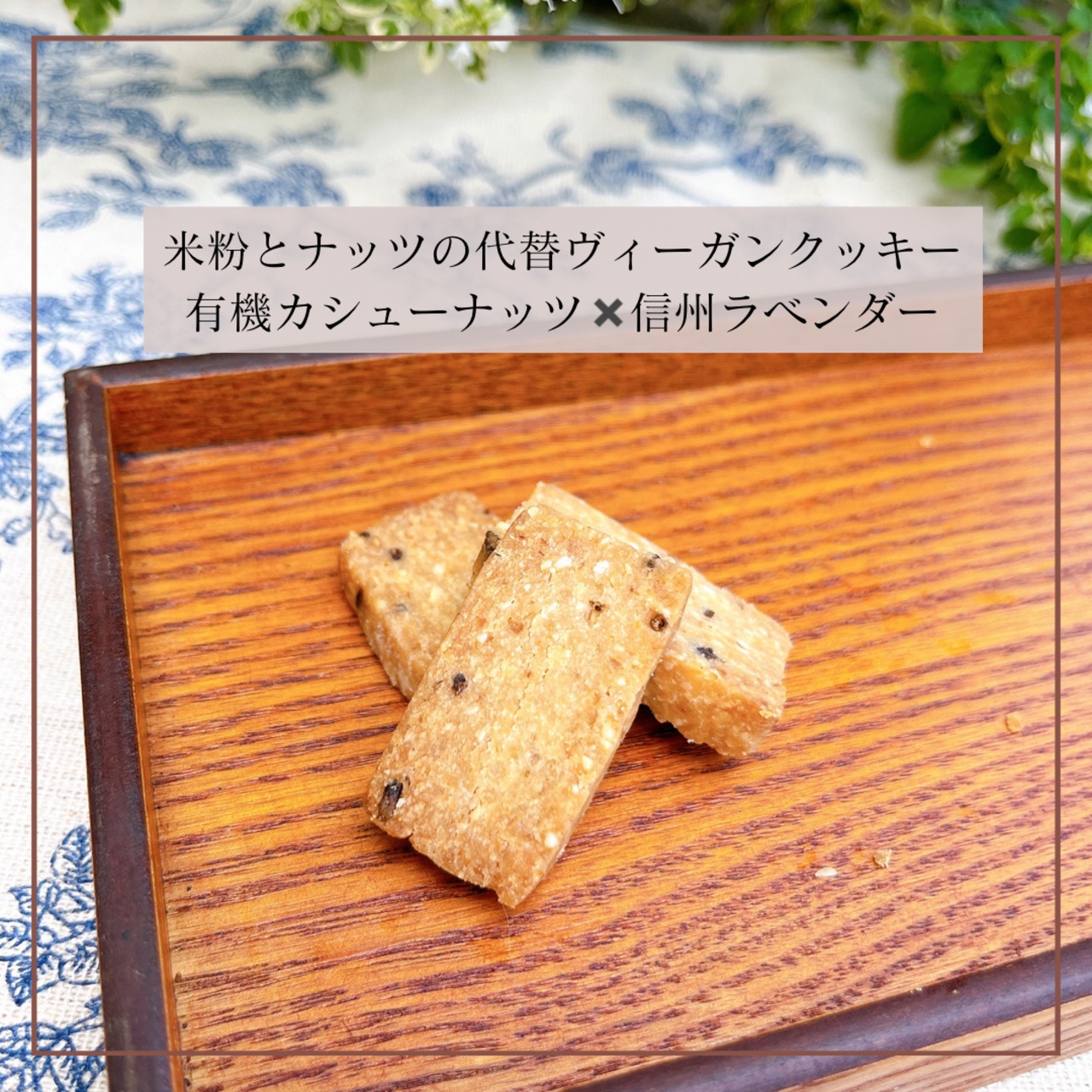 有機オートミールと米粉のちょっと塩気のある生地に、有機ラベンダーを混ぜ込みました。ふんわりとラベンダーが香ります♪
