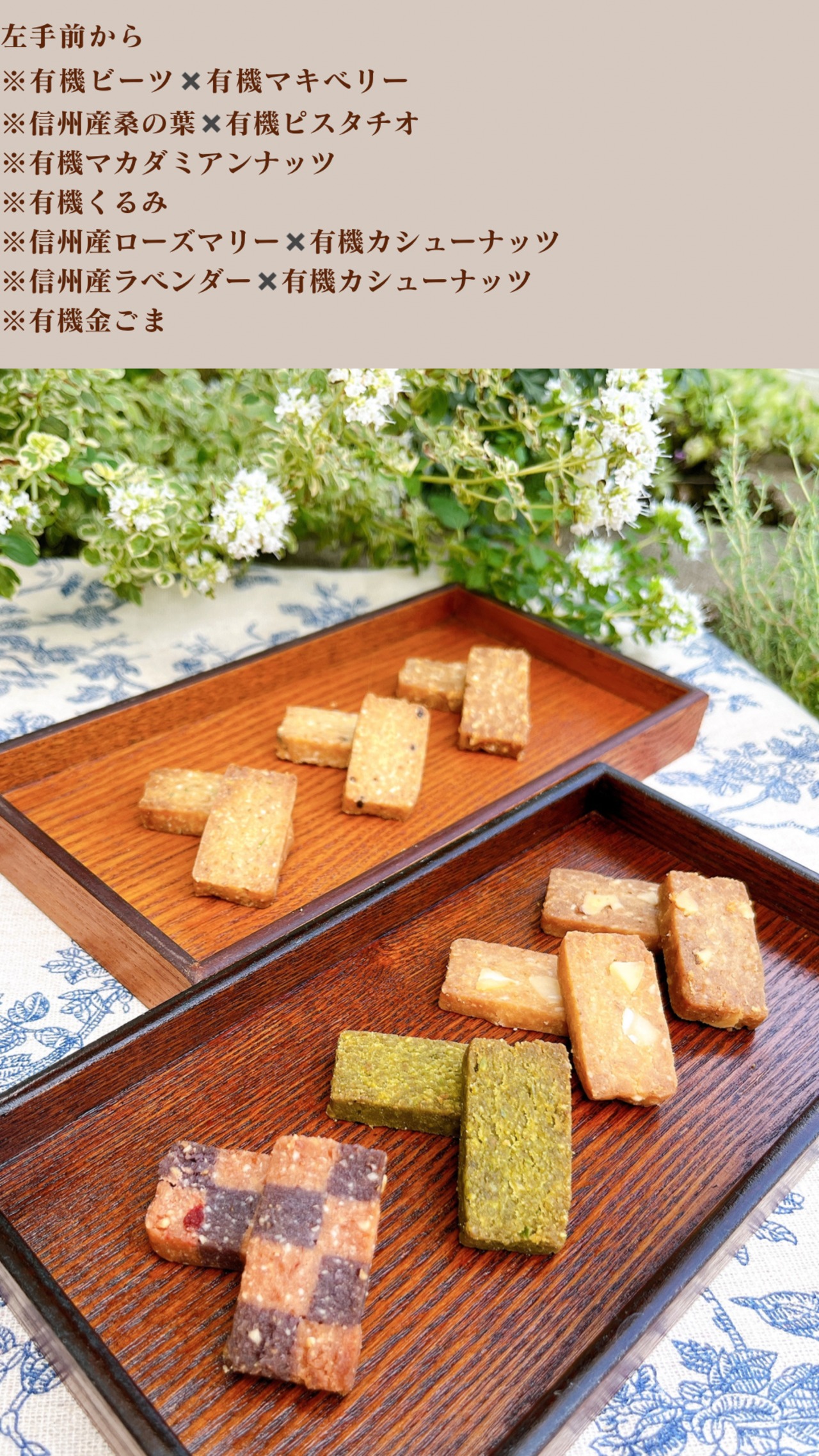 原材料 米粉(長野県池田町産)、有機オートミール(アメリカ産)、米ぬか油(国産)、ローストアマニ、有機ココナッツシュガー、はしばみ、有機ヘーゼルナッツ、有機くるみ、信州くるみ、有機アーモンド、有機カシューナッツ、有機マカダミアナッツ、ピスタチオ、ドライりんご、ドライ柿、有機ドライパイン、有機金ごま、有機クコの実、有機松の実、有機ひまわりの種、有機レーズン、信州ソルガム、寿塩、等々