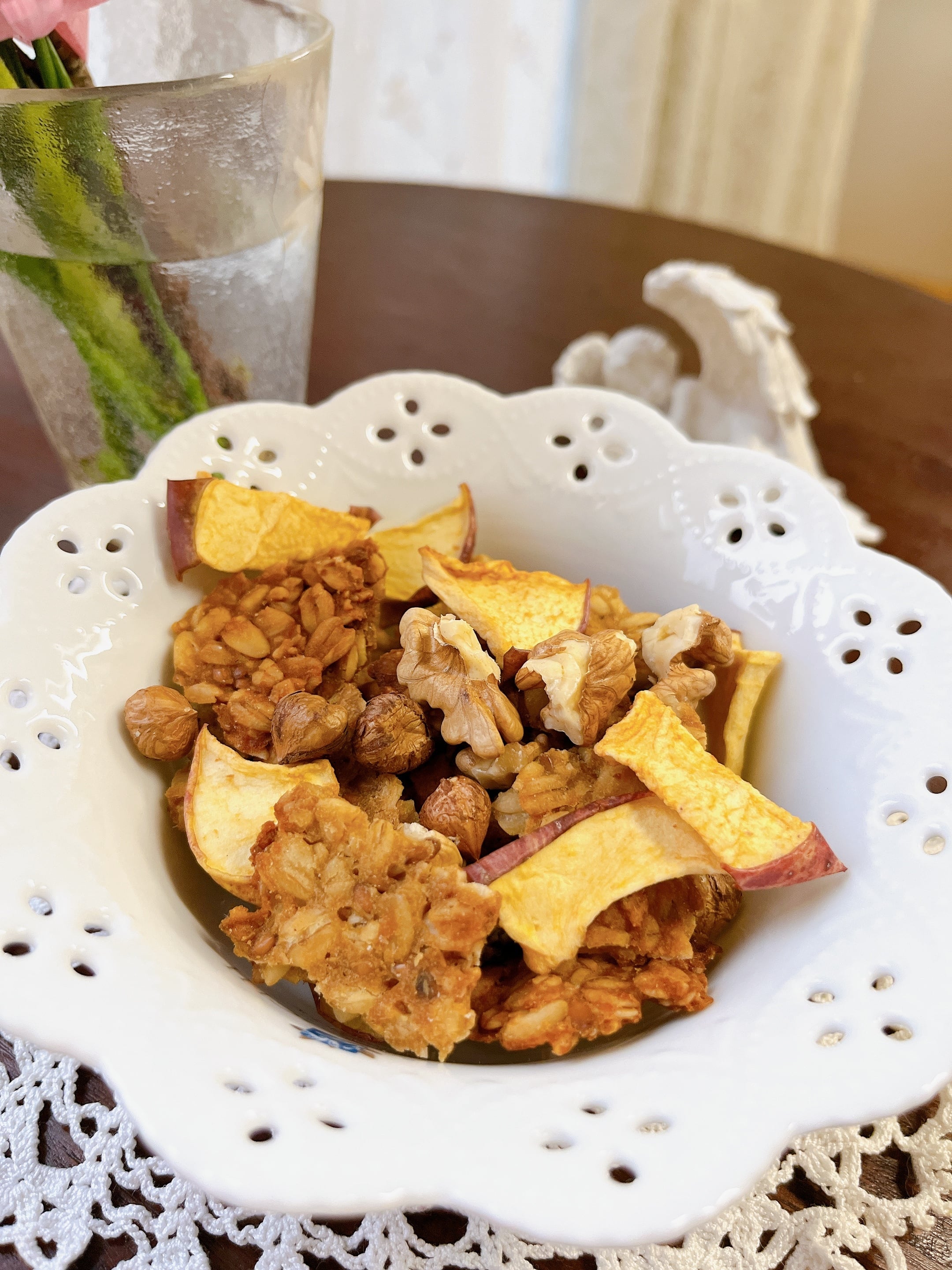 チョコ味のグラノーラに、信州有機りんご、有機クランベリー、有機クナリナッツを合わせました。