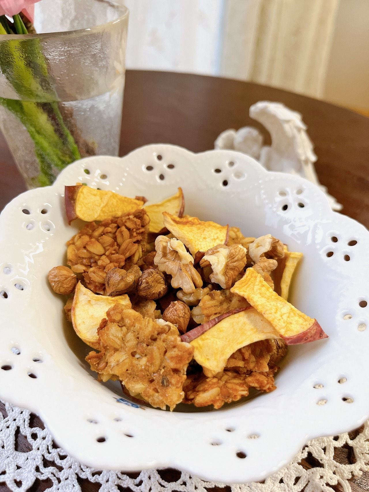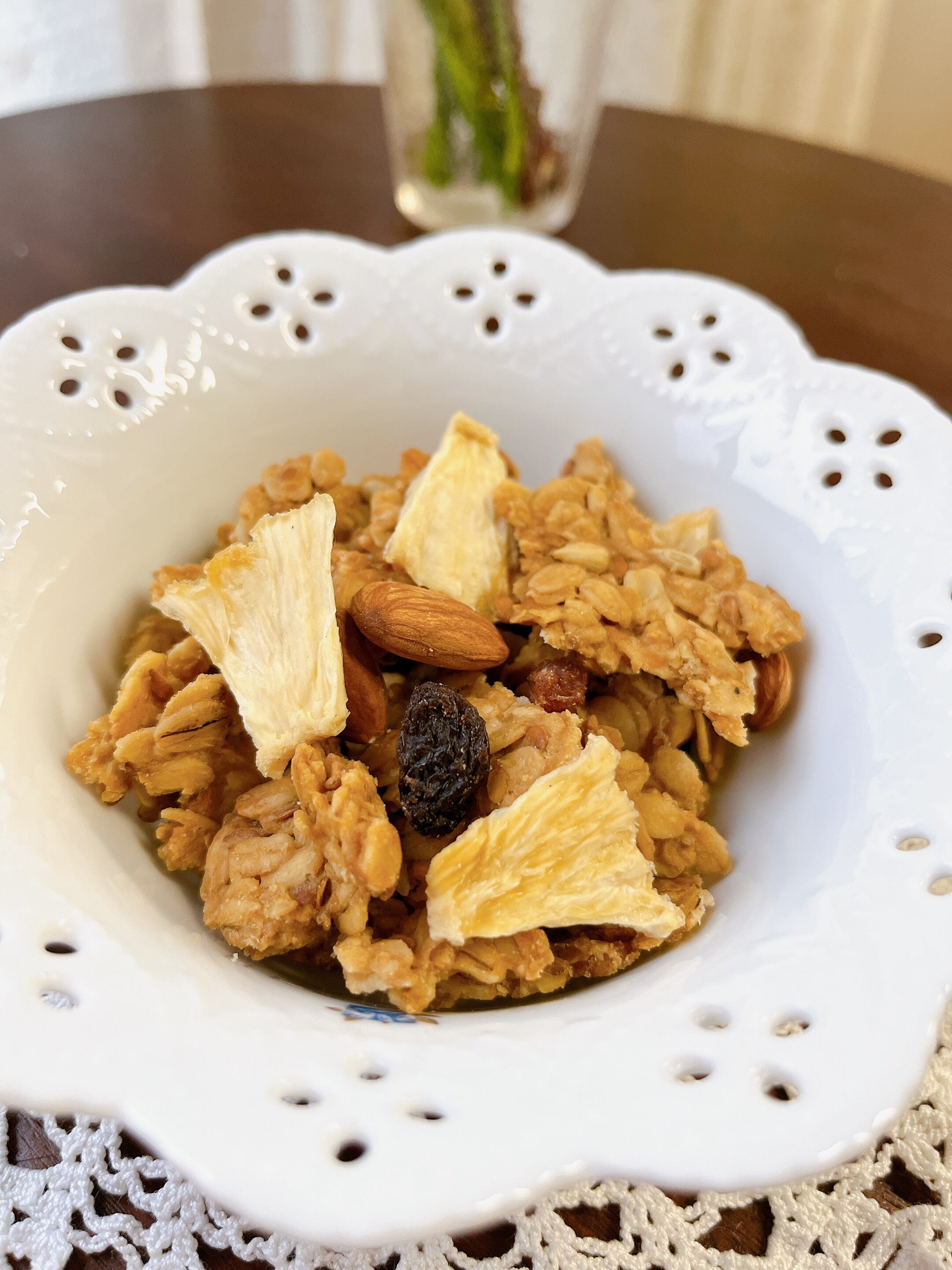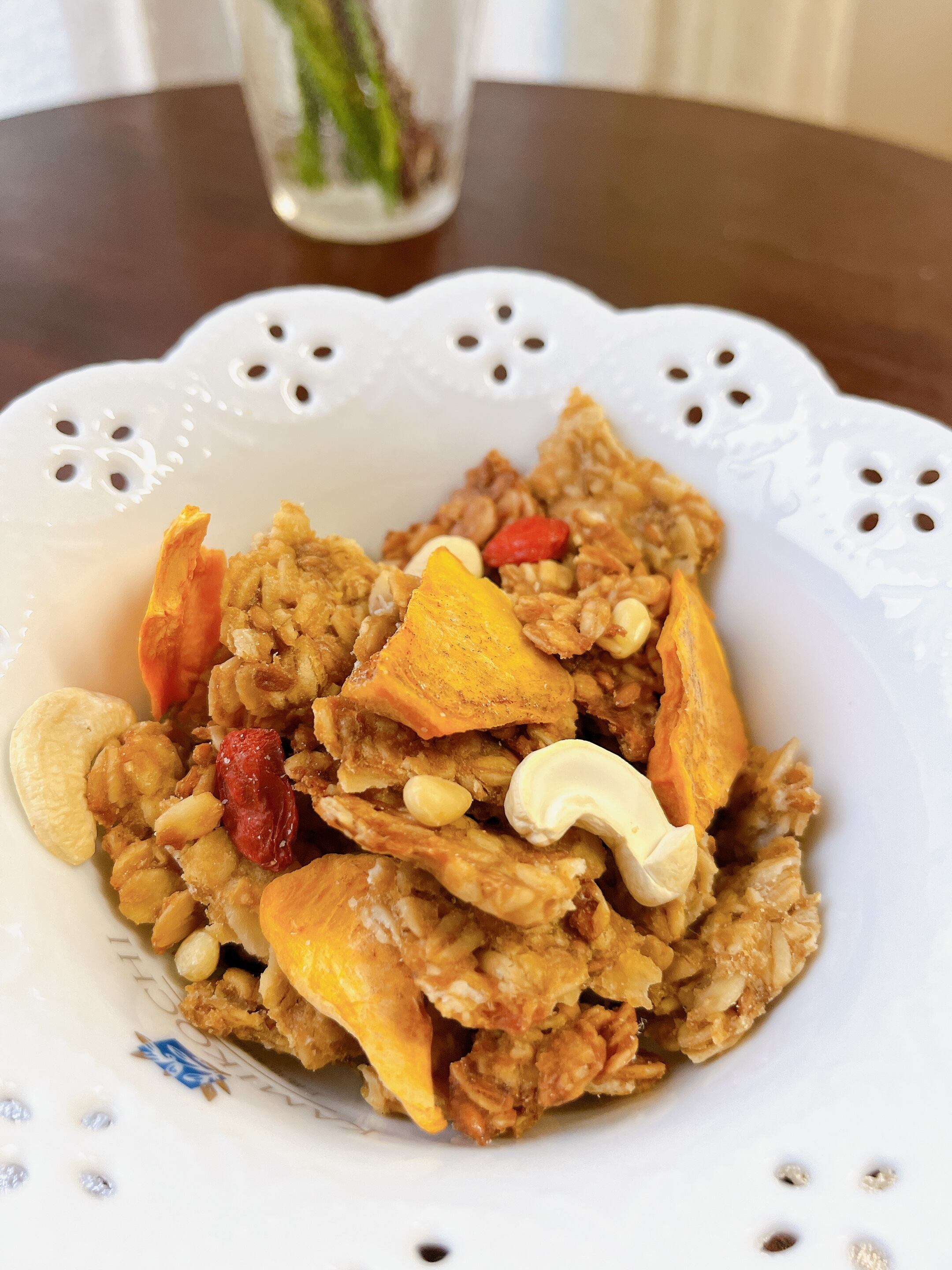 グルテンフリー、ヴィーガン仕様のグラノーラ。ナッツや自家製ドライフルーツはロー(非加熱)の為、加熱すると破壊されてしまう栄養素も残っています。